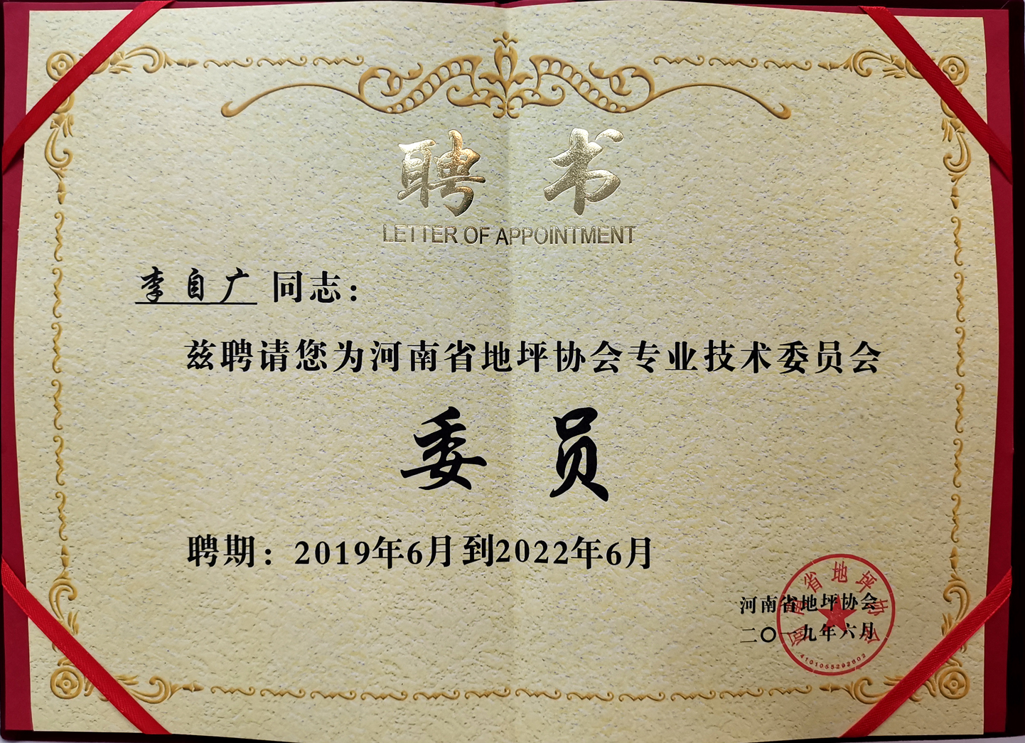 榮獲:河南省地坪協會**技術委員會:“委員”稱號